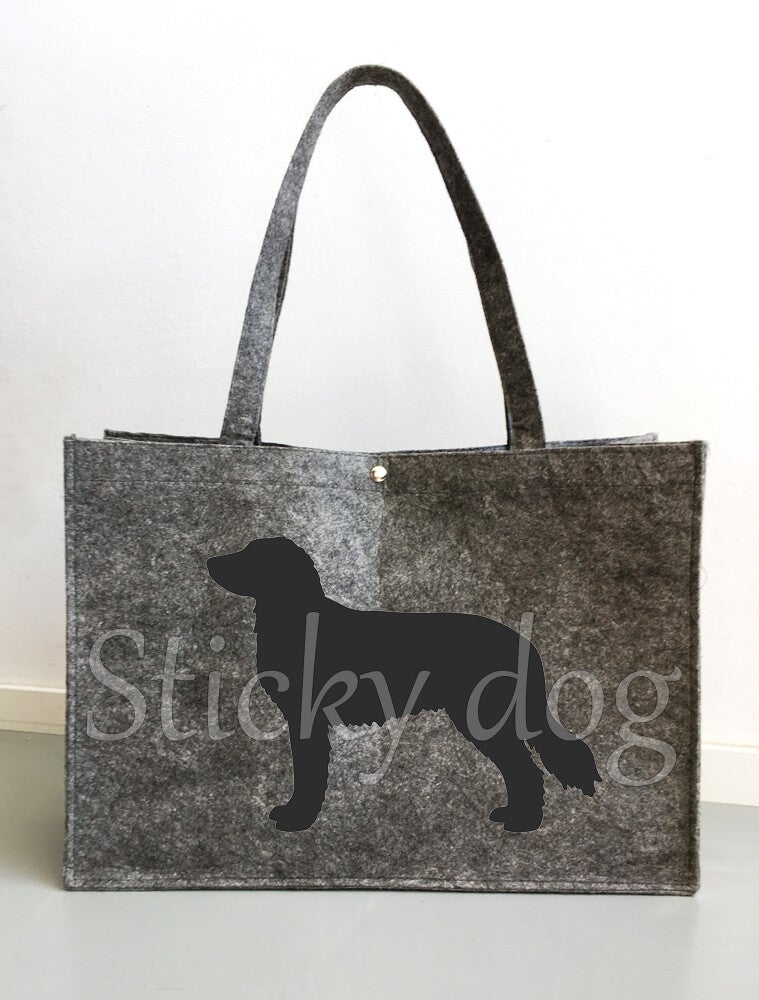 Grey felt bag with long carrying handles and hard plastic bottom.